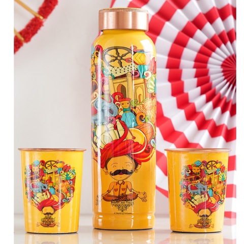 IndianArtVilla Juego de regalo de botella y vidrio de cobre, diseño de tema impreso de Rajasthani para uso diario, 900 ML